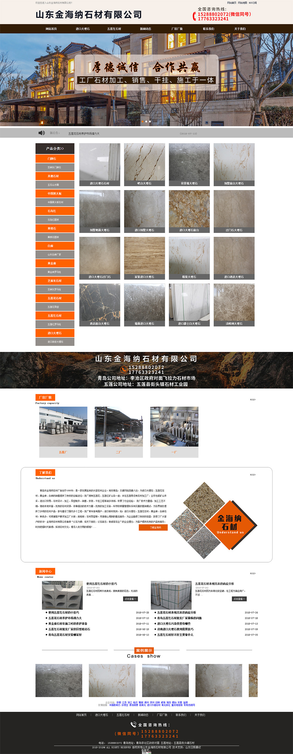 • 青島市金海納石材廠始 創(chuàng)于1998年,是一家發(fā)展起來(lái)的大型石材企業(yè)。地處青島,交通網(wǎng)絡(luò)四通八達(dá),為進(jìn) 口大理石、五蓮花石材、黃金麻、白麻的銷售提供了良好的運(yùn)輸途徑。我廠擁 有五蓮花、五蓮紅礦山各一座,并在五蓮縣設(shè)有石材加工廠,業(yè)務(wù)包括礦山開采、進(jìn)出口貿(mào)易、石材設(shè)計(jì)、加工、異型制作、銷售、安裝、干掛工程等諸多領(lǐng)域,積累了行業(yè)經(jīng)驗(yàn)。 我廠技 術(shù)力量強(qiáng),加工工藝不錯(cuò),借助本地優(yōu)良的石材資源,依靠強(qiáng)勁的技 術(shù)力量、優(yōu)良的加工設(shè)備、科學(xué)的質(zhì)量管理體系和完善的營(yíng)銷模式,為各界朋友提供了多樣的石材產(chǎn)品,參與建設(shè)了國(guó)